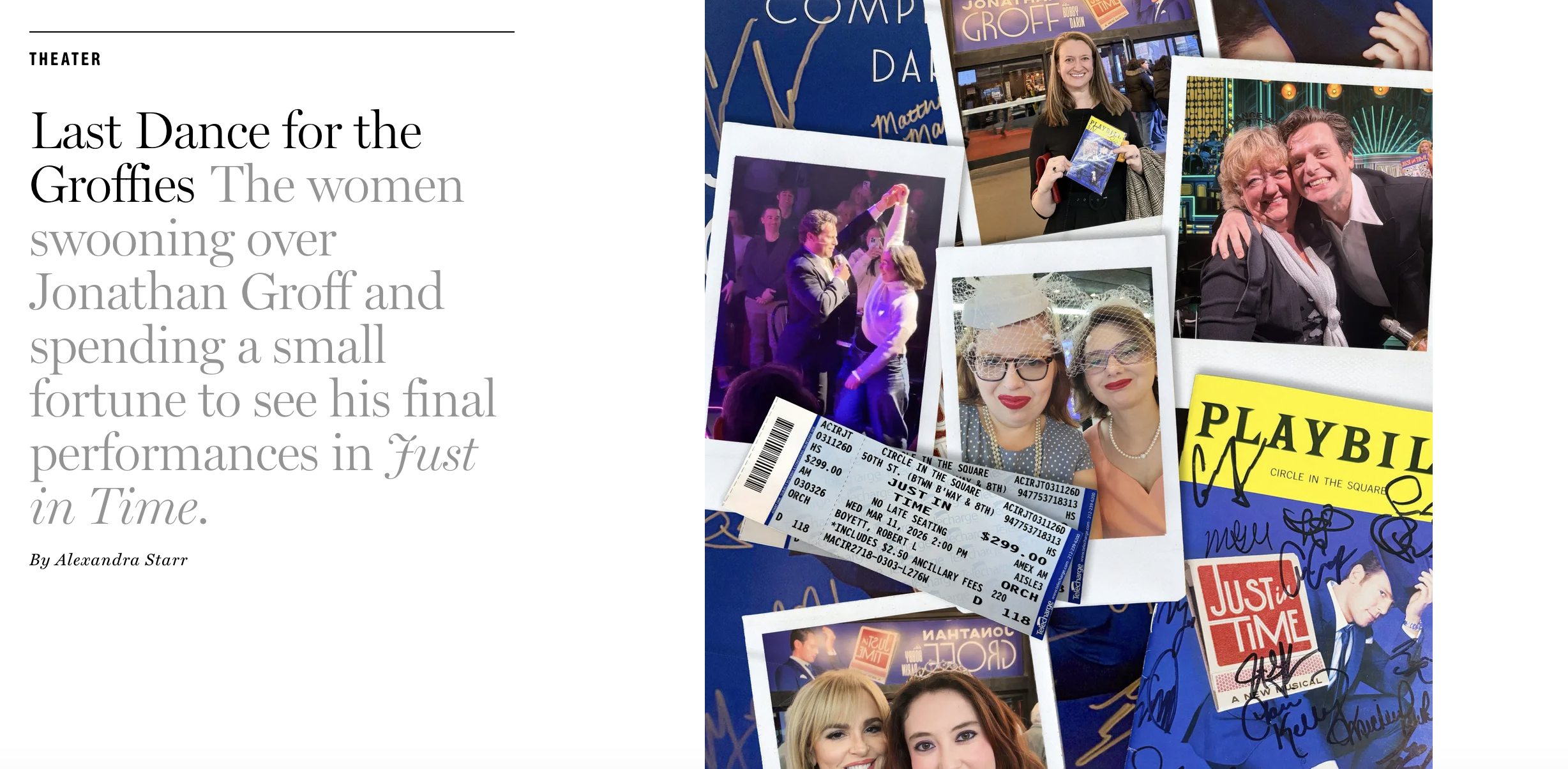 I had the pleasure of writing about the hard-core devotees of Jonathan Groff in “Just in Time.” I love live theater and I am a big admirer of Groff. His performance in “Just in Time” — he plays the mid-century crooner Bobby Darin — carries the show. And I thought he was a revelation in “Merrily We Roll Along.”